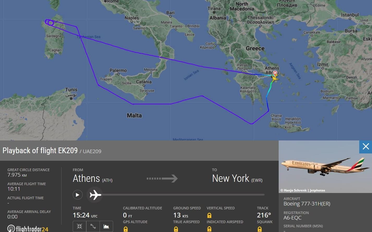 Allerta sui cieli d'Italia. L'allarme è scattato su un Boeing 777 di Emirates, volo EK209, partito dall’aeroporto internazionale di Atene "Eleftherios Venizelos” e diretto a New York. A far salire la preoccupazione è stato un passeggero considerato ''sospetto'', scrive il quotidiano greco Ekathimerini. Al volo, con 246 persone a bordo, è stato ordinato di tornare ad Atene quando si trovava in volo sopra la Sardegna. Qui ha dovuto compiere movimenti circolari: ha girato tre volte sopra Sassari, per poter rientrare nella capitale greca per essere sottoposto a controlli di sicurezza. Nelle procedure sono stati coinvolti i servizi anti-terrorismo. Un passeggero sarebbe stato fermato al ritorno a terra per ulteriori accertamenti.