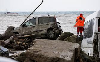 I detriti e i resti di alcune auto sulla battigia a Casamicciola