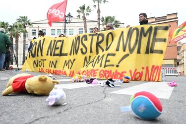 La squadra di governo è arrivata poco prima delle 16 nella cittadina calabrese, in provincia di Crotone, simbolo della tragedia in cui, lo scorso 26 febbraio, sono morte oltre 70 persone. Sui muri della città sono apparse scritte di protesta contro l'esecutivo. "Benvenuti nel nulla", si legge in un caso. "Cutro non difende Piantedosi", recitava un altro messaggio poi cancellato. "Not in my name" - "Non a nome mio" - è quello che è scritto invece sui cartelli che un gruppo di manifestanti ha sollevato all'arrivo dei ministri. Verso le auto con a bordo gli esponenti del governo i manifestanti hanno urlato "vergogna" e hanno lanciato diversi pupazzi di pelouche.