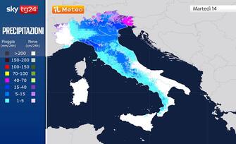 Martedì 14 giornata di maltempo con piogge anche intense al Nord Est, su gran parte del Centro tirrenico e nel corso del pomeriggio/sera fino al basso Tirreno