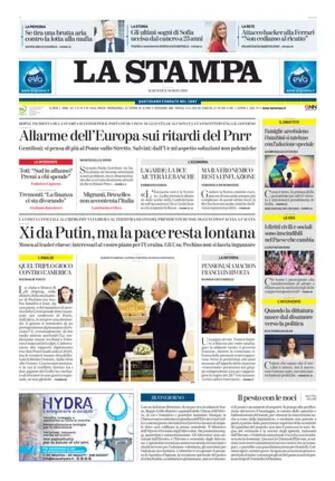 La Stampa: anche il quotidiano di Torino apre sull'allarme dell'Europa per i ritard del Pnrr. In taglio centrale la stretta di mano tra Xi, presidente della Cina, e Vladimir Putin, presidente della Russia