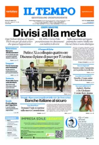 Il Tempo: in apertura il titolo "Divisi alla meta" con le crepe della sinistra. Anche Il Tempo dedica il taglio centrale alla visita di Xi, presidente della Cina, a Mosca