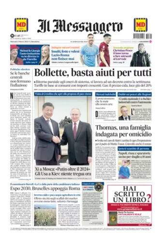 Il Messaggero: apertura con "Bollette basta aiuti per tutti". E spazio con foto nel taglio centrale per la stretta di mano tra Xi, presidente della Cina, a Vladimir Putin nella sua visita Mosca. Taglio alto dedicato ai veleni post derby tra Lazio e Roma