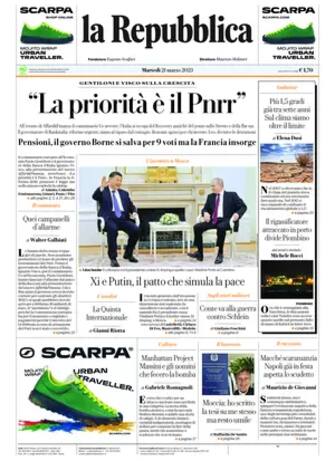 Repubblica: apertura dedicata a un tema di economia con il titolo "La priorità è il Pnrr". Taglio centrale, invece, alla visita del presidente della Cina Xi a Mosca