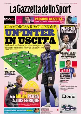 La Gazzetta dello Sport: dedica la sua apertura alla rivoluzione in casa Inter, dopo le delusioni in campionato (nove sconfitte su 27). C'è una squadra intera in uscita. Mentre la Juventus studia il piano Rabiot-bis