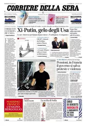 Corriere della Sera: in apertura spazio alla viista del presidente della Cina, Xi, a Mosca: "Xi-Putin, gelo degli Usa". Taglio centrale spazio alla sparatoria di Napoli nella quale è morto un ragazzo di 18 anni e il caso pensioni in Francia