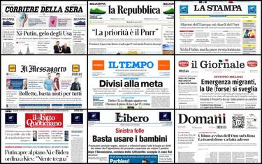 Le aperture della maggior parte dei giornali sono dedicate alla visita di Xi, presidente della Cina, a Mosca per incontrare Vladimir Putin. Oltre all'omicidio, nella sparatoria a Napoli, di un ragazzo di 18 anni e all'allarme dell'Europa per i ritardi del Pnrr