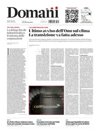 Domani: con il titolo "Ultimo avviso dell'Onu sul clima. La transizione va fatta adesso" il quotidiano pone l'accento sul disastroso cambiamento climatico che sta colpendo il nostro pianeta