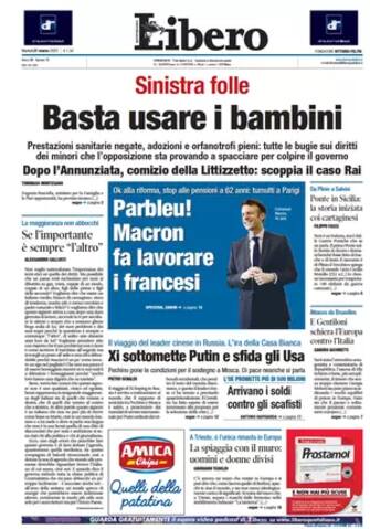 Libero: con il titolo "Basta usare i bambini" in apertura, il quotidiano analizza le presunte bugie della sinistra sui diritti dei minori. Taglio centrale dedicato alla Francia: "Parbleu! Macron fa lavorare i francesi"