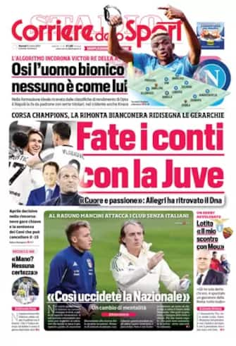 Corriere dello Sport: pone l'attenzione in apertura sulla Juventus con il titolo "Fate i conti con la Juve". Spazio anche per un'analisi sul Napoli, che aspetta solo l'aritmetica certezza per festeggiare il terzo scudetto della propria storua, e al raduno della Nazionale in vista delle qualificazioni a Euro2024