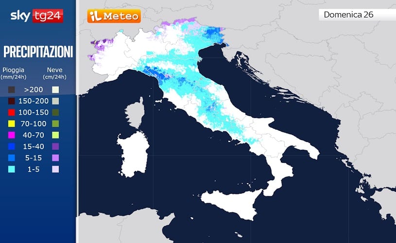 Secondo ilmeteo.it, dopo una mattinata prevalentemente stabile, il tempo tenderà a peggiorare con temporali e possibili grandinate dalle Alpi verso la Lombardia, il Triveneto, la Liguria, Umbria e zone interne del Lazio. Venti in ulteriore rinforzo. Neve fino a 1400 metri sull'Appennino. Al Sud tempo ancora stabile, in nottata arrivo locali piogge su Campania, alta Calabria e Sardegna occidentale. Temperature in generale diminuzione su tutte le regioni.
