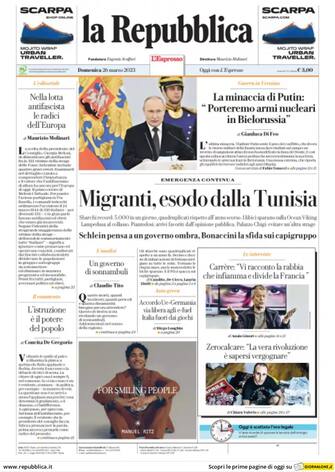Repubblica: apertura con il titolo "La minaccia di Putin: porteremo armi nucleari in Bielorussia". Taglio centrale dedicato al tema dei Migranti: "Migranti, esodo dalla Tunisia"