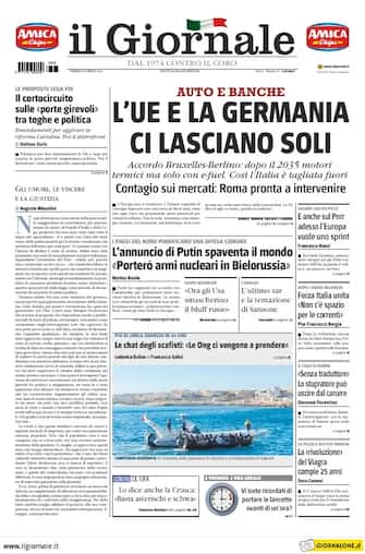 Il Giornale: apertura dedicata ad auto e banche con il titolo: "L'Ue e la Germania ci lasciano soli". Taglio centrale su Putin, che minaccia di portare le armi nucleari in Bielorussia