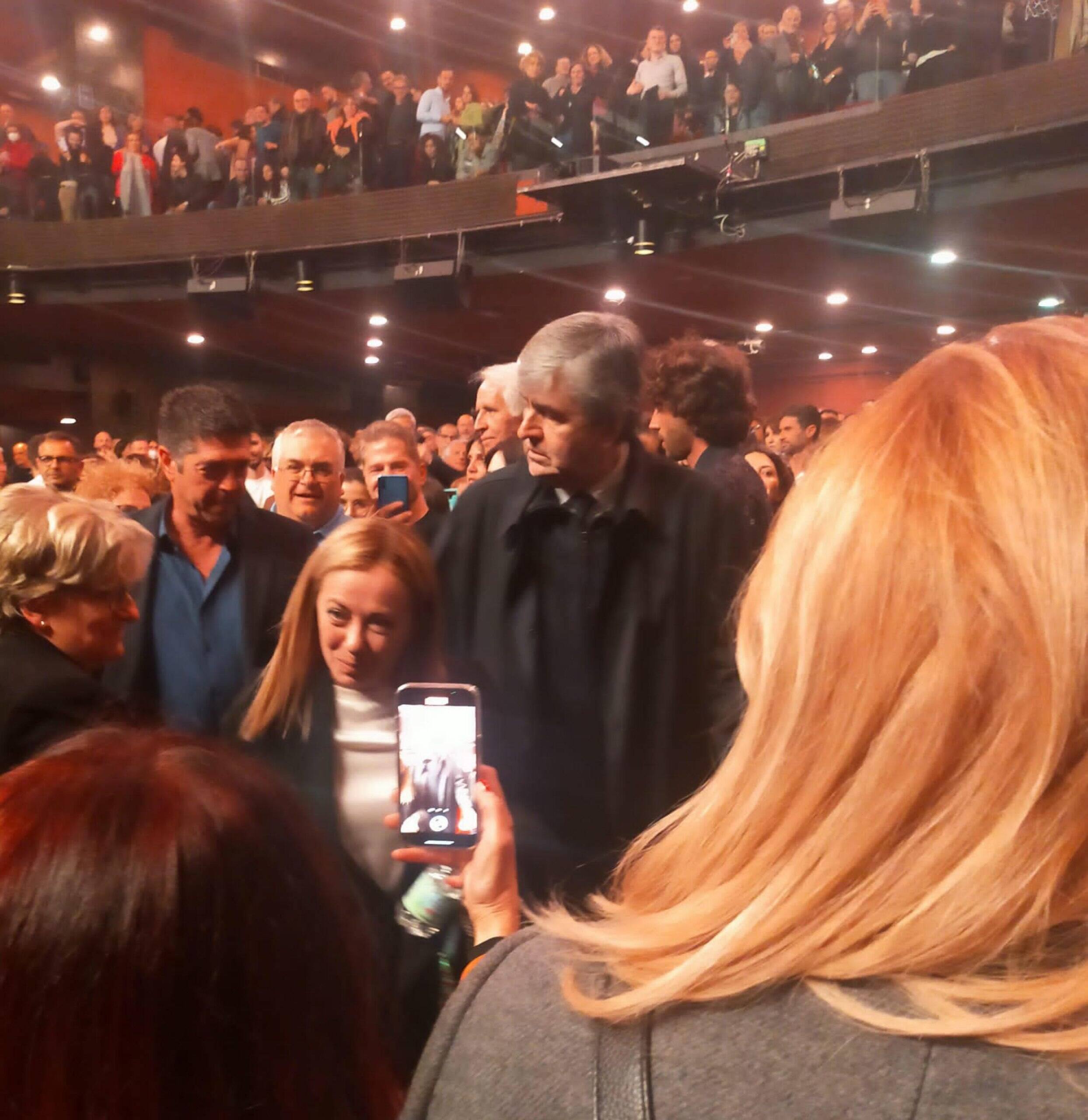 Entrata a luci spente, un minuto prima che si aprisse il sipario, la premier Giorgia Meloni ha trascorso la serata al teatro Brancaccio di Roma per assistere allo spettacolo "Amore + Iva", di Checco Zalone. Dopo un paio d'ore di show, il comico pugliese ha rivelato agli spettatori, alla sua maniera, la presenza di Meloni in mezzo al pubblico. "Non mi fate fare figure di m.... che c'è la presidente del consiglio qua che ha preferito il mio spettacolo al karaoke con Macron", ha detto. Quando si sono riaccese le luci in sala, Meloni, scortata, tra gli altri, dal compagno Andrea Giambruno e dal sottosegretario alla Cultura, Gianmarco Mazzi, ha lasciato il teatro tra la curiosità dei presenti e qualche applauso.