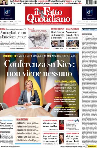 Il Fatto Quotidiano: apertura con il titolo "Conferenza su Kiev: non viene nessuno". "Meloni flop: il vertice sulla ricostruzione annunciato da lei e Zelensky"