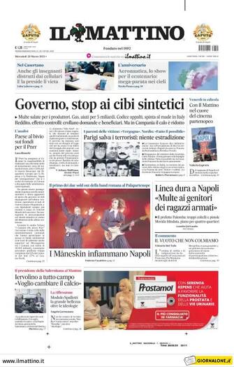 Il Mattino: titolo con apertura "Governo, stop ai cibi sintetici". Spazio anche per il no della Francia all'estradizione dei terroristi: "Parigi salva i terroristi, niente estradizione"