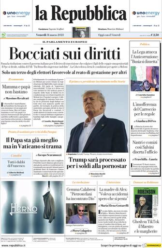 La Repubblica: apertura con il titolo "Bocciati sui diritti". Al Parlamento europeo passa la risoluzione contro il governo italiano per il divieto di trascrizione che colpisce i figli delle coppie omogenitoriali