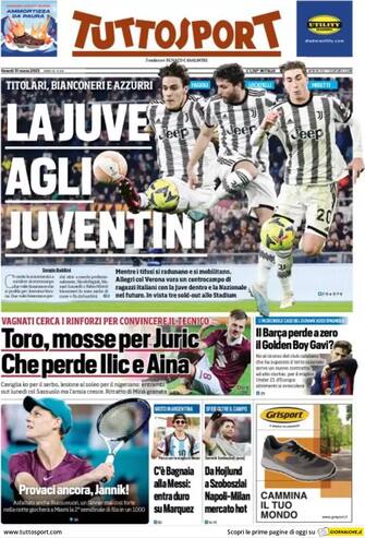 Tuttosport: "La Juve agli juventini" è il titolo di apertura del quotidiano torinese. Spazio anche per il Torino: Juric perde Ilic e Aina e studia le mosse per sostituirli