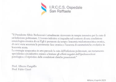Intanto, a poco più di 24 ore dal nuovo e improvviso ricovero presso il nosocomio milanese, è stato diffuso il primo bollettino medico che fa luce sulle condizioni di Silvio Berlusconi (QUI IL NOSTRO LIVEBLOG). “Il Presidente Silvio Berlusconi è attualmente ricoverato in terapia intensiva per la cura di un'infezione polmonare. L'evento infettivo si inquadra nel contesto di una condizione ematologica cronica di cui Egli è portatore da tempo: leucemia mielomonocitica cronica, di cui è stata accertata la persistente fase cronica e l'assenza di caratteristiche evolutive in leucemia acuta”. Il bollettino è stato firmato da Alberto Zangrillo, medico personale dell’ex premier, e da Fabio Ciceri.