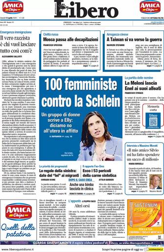 Libero: apertura con titolo "100 femministe contro la Schlein". Un gruppo di donne scrive a Ely: diciamo no all'utero in affitto