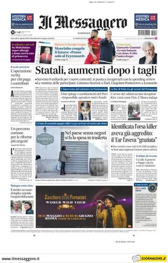 Il Messaggero: apertura con titolo "Statali, aumenti dopo i tagli". Spazio anche al ragazzo ucciso da un orso in Trentino: "Identificata l'orsa killer, aveva già aggredito: il Tar l'aveva graziata"