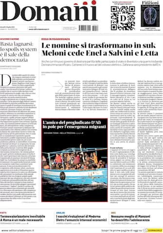 Domani: apertura dedicata alle nomine con il titolo "Le nomine si trasformano in suk. Meloni cede Enel a Salvini e Letta"