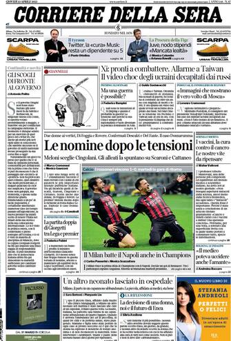 Corriere della Sera: apertura con titolo "Le nomine dopo le tensioni". Meloni sceglie Cingolani. Gli alleati la spuntano su Scaroni e Cattane. Spazio anche alla vittoria del Milan a San Siro contro il Milan nell'andata dei quarti di Champions