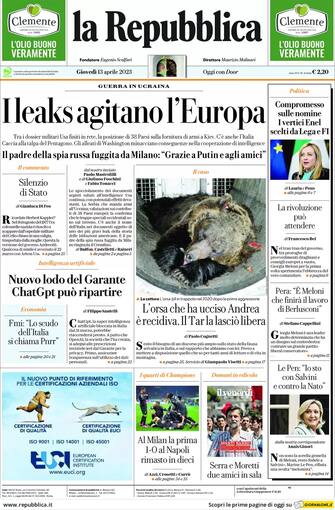 La Repubblica: apertura con titolo "I leaks agitano l'Europa". Trai dossier militari Usa finiti in rete, la posizione di 38 paesi sulla fornitura di armi a Kiev. C'è anche l'Italia. Caccia alla talpa del Pentagono. Gli alleati di Washington minacciano conseguenze nella loro cooperazione di intelligence