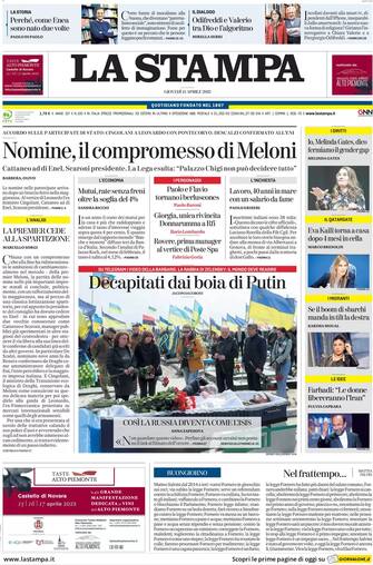 La Stampa: apertura con titolo "Nomine, il compromesso di Meloni". Taglio centrale dedicato a "Decapitati dai boia di Putin"