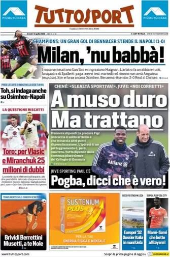 Tuttosport: apertura con titolo "A muso duro, ma trattano", sull'indagine sportiva sulle plusvalenze bianconere. Spazio anche alla vittoria del Milan contro il Napoli: "Milan, 'nu babbà"