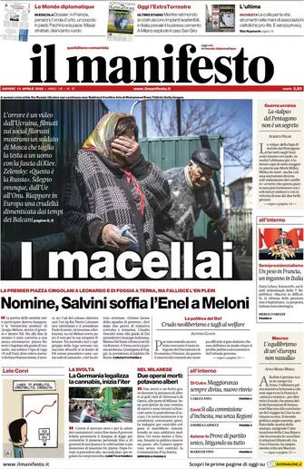 Il Manifesto: "I macellai", è il titolo di apertura. L'orrore è un video dall'Ucraina, filmati sui social filorussi mostrano un soldato di Mosca che taglia la testa a un uomo con la fascia di Kiev