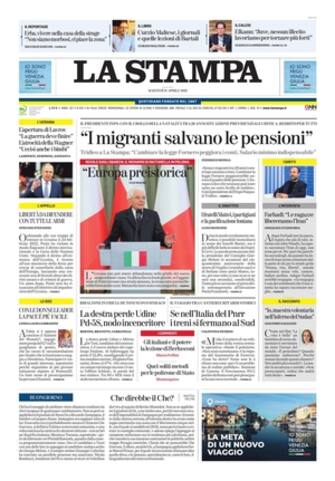 La Stampa: apertura con titolo "I migranti salvano le pensioni. Spazio anche alle parole di Sergio Mattarella in Polonia: "Europa preistorica"