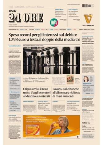 Il Sole 24 Ore: apertura con titolo "Spesa record per gli interessi sul debito: 1.398 euro a testa, il doppio della media Ue. Spazio anche all'apertura del Salone del Mobile a Milano