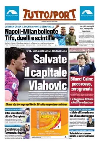 Tuttosport: apertura con titolo "Salvate il capitale Vlahovic". L'attaccante è in crisi. In bianconero non riesce a esprimersi ai suoi livelli. Spazio anche al ritorno dei quarti di Champions tra Napoli e Milan: "Tifo, duelli e scintille"