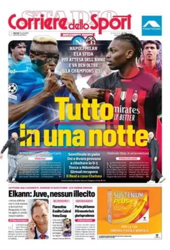 Corriere dello Sport: "Tutto in una notte", è il titolo di apertura che celebra il ritorno dei quarti di finale, al Diego Armando Maradona, tra Napoli e Milan. Luciano Spalletti ritrova Osimhen al centro dell'attacco
