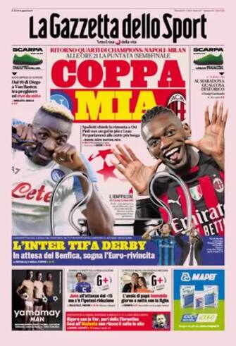 La Gazzetta dello Sport: "Coppa Mia", è il titolo di apertura dedicato al ritorno dei quarti di Champions tra Napoli e Milan. I rossoneri partono in vantaggio, grazie all'1-0 dell'andata del 12 aprile, ma il discorso qualificazione è apertissimo