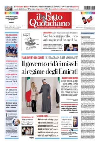 Il Fatto Quotidiano: apertura con titolo "Il governo ridà i missili al regime degli Emirati". Via il divieto di Conte: tolto da Draghi sulle armi leggere