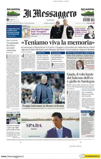 Il Messaggero: apertura con titolo "Teniamo viva la memoria". L'esortazione di Mattarella per il 25 aprile e l'omaggio a chi ha lottato per indipendenza e libertà. Spazio al ko della Roma contro l'Atalanta: "Troppi infortuni, la Roma si ferma"