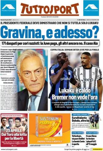 Tuttosport: apertura con titolo "Gravina, e adesso?". Il presidente Federale deve dimostrare che non si tutela solo Lukaku