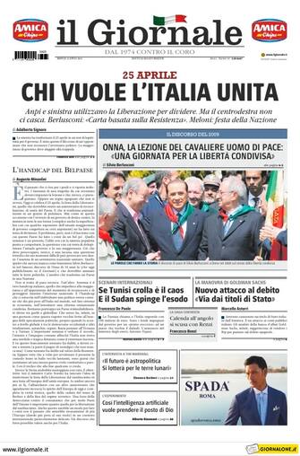 Il Giornale: apertura con titolo "25 aprile: chi vuole l'Italia unita". Anpi e sinistra utilizzano la Liberazione per dividere. Ma il centrodestra non ci casca. Berlusconi: "Carta basata sulla Resistenza". Meloni: festa della Nazione