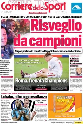 Corriere dello Sport: apertura con titolo "Risveglio da campioni". Napoli portato in trionfo: a Capodichino cantano in 10mila. Spazio a "Roma, frenata Champions"
