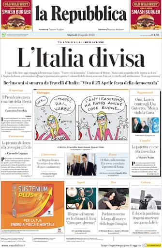 La Repubblica: apertura con titolo "78 anni dalla Liberazione: l'Italia divisa". Berlusconi si smarca da Fratelli d'Italia: "Viva il 25 aprile festa della democrazia"