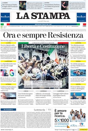 La Stampa: apertura con titolo "Ora e sempre Resistenza". Mattarella oggi a Cuneo: Teniamo viva la memoria di chi ha combattuto in difesa dei nostri ideali e della democrazia"