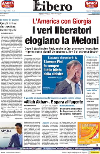 Libero: apertura con titolo "L'America con Giorgia: i veri liberatori elogiano la Meloni". Spazio a "E invece Fini fa sempre l'utile idiota della sinistra"