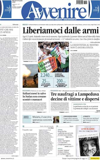 Avvenire: apertura con titolo "Liberiamoci dalle armi". Oggi il 25 aprile. Mattarella: tenere viva la memoria. Spazio a "Italiani messi in salvo. In Sudan non cessano scontri e massacri"