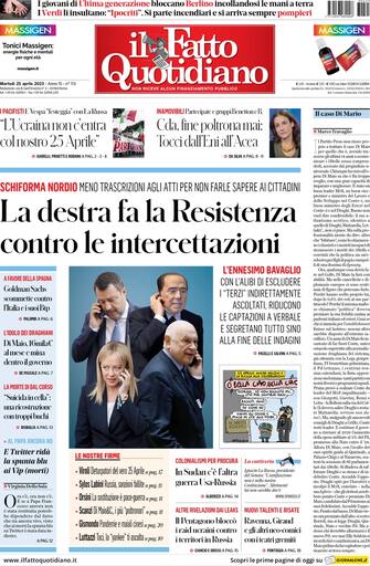 Il Fatto Quotidiano: apertura con titolo "La destra fa la Resistenza contro le intercettazioni". Meno trascrizioni agli atti per non farle sapere ai cittadini