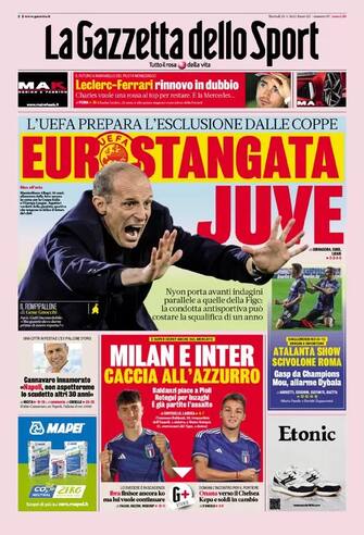 La Gazzetta dello Sport: apertura con titolo "Eurostangata Juve". L'Uefa prepara l'esclusione dalle coppe. Spazio a "Milan e Inter, caccia all'azzurro". Baldanzi piace a Pioli. Retegui per Inzaghi: è già partito l'assalto