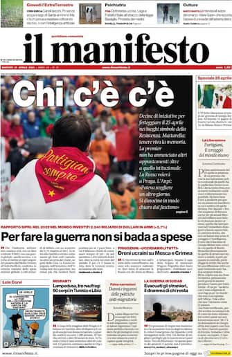 Il Manifesto: apertura con titolo "Chi c'è c'è". Decine di iniziative per festeggiare il 25 aprile nei luoghi simbolo della Resistenza. Mattarella: tenere viva la memoria. La Premier non ha annunciato altri appuntamenti oltre a quello istituzionale. La Russa volerà a Praga