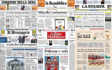 Aperture dei quotidiani con la dichiarazione dell'Oms della fine dell'emergenza sanitaria internazionale dovuta al Covid e con le strategie del Governo Meloni sul presidenzialismo