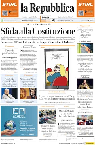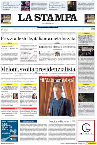 La Repubblica: Apertura con titolo: "Sfida alla Costituzione". In difficoltà su migranti e Pnrr, la premier punta sull'elezione diretta del capo dello Stato. Martedì summit a palazzo Chigi. Schlein e Calenda accettano l'invito, Conte diserta. Pasquale Tridico: "La mia sostituzione è un colpo d'ascia contro l'Inps"